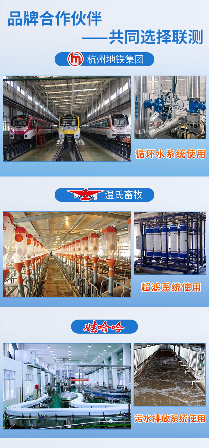 近年來,聯(lián)測儀表廣泛應(yīng)用于各大領(lǐng)域,與國內(nèi)品牌杭州地鐵集團、溫氏畜牧、娃哈哈......達(dá)成合作,專業(yè)的技術(shù),敬業(yè)的服務(wù)贏得了諸多企業(yè)的信賴與支持。本次合作也給客戶留下了良好的印象,好評連連,溫州繞城高速公路有限公司表示,后續(xù)多個站點會批量使用我司電磁流量計。